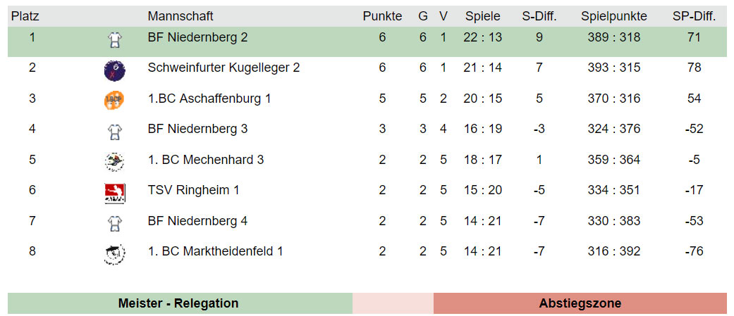 BFN 3 musste gegen Ringheim 1 und BCP Aschaffenburg 1 zwei Niederlagen einstecken und beendete die Saison auf dem vierten Platz.